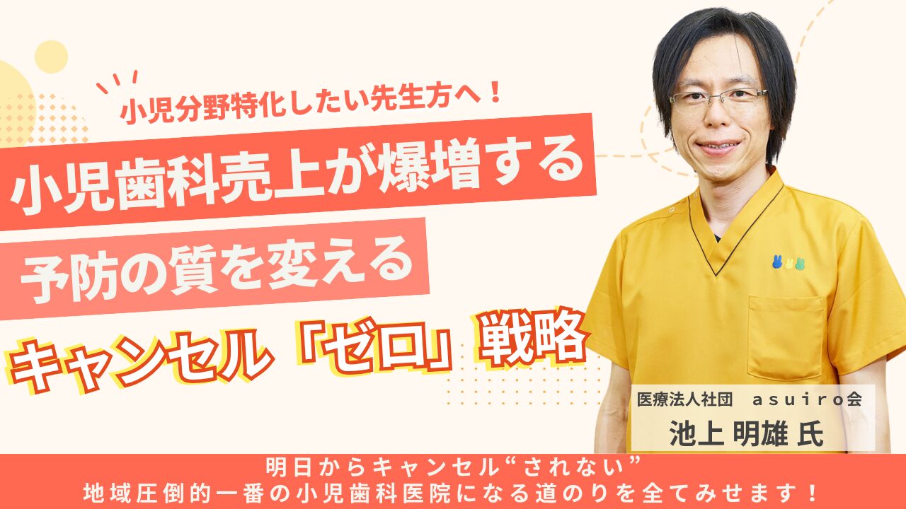 上記の内容は、広島でご開業されている医療法人社団asuiro会 いけがみ小児歯科様のお話でございます。理事長の池上先生に今回ご登壇いただきまして、日々医院で実践されている上記の具体的な取り組みについてお話していただきます。